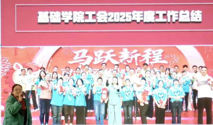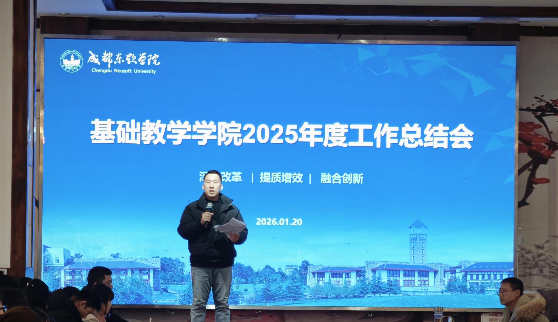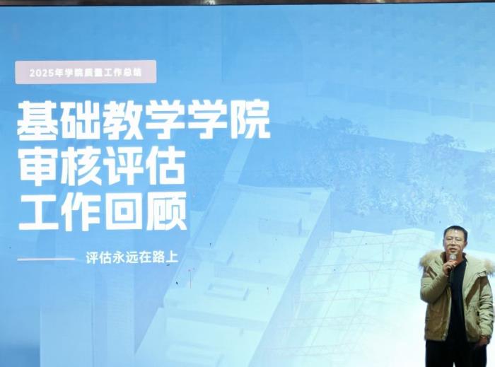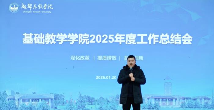 2026年1月20日,基础教学学院于青城海棠苑大厅召开2025年度工作总结大会,全体教师参会。会议由常务副院长余敏锋主持。