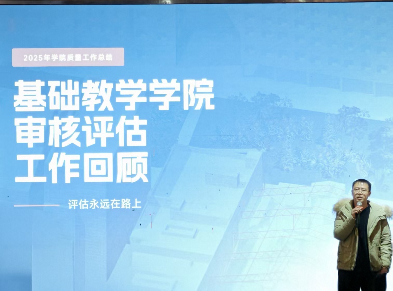 副院长古彬对审核评估工作进行总结。 他回顾了学院三年多的评建历程,强调评估是“健康体检与成长促进”,肯定了全体教师的根本贡献。他指出评估已转入整改与常态化阶段,未来将着力构建“自觉、自省、自律、自查、自纠”的质量文化,推动工作重心向深度质量建设转变。